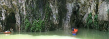水洞長1000余米,半是人工半天然,登舟入洞,借助稀疏的燈光和導游的手電筒辨認著一處一處各各不同的景物,頗有一點神秘之感。洞盡船出,豁然開朗,但見茂竹修篁叢叢簇簇,一泓綠水微波不興,野趣天成,靜謐無聲,此處名“竹林翠溪”,宛如一世外桃源。旱洞共三層,滿布著形態各異的石鐘乳、石筍、石柱、石幔,其第三層洞廳軒敞,一座天然石橋飛架兩懸崖間,人稱“奈何橋”,橋下即是深不可測的陰潭,景觀之奇特,令人叫絕。旱洞出口處,有苗寨一座,是專為旅游者興建的,游人盡可在此親身體驗一次苗家的婚俗。