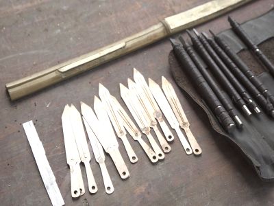 圖片說明:貴州貴陽清鎮(zhèn)市流長鄉(xiāng)腰巖村苗族制作口弦所需材料和工具-銅黃片、竹子、小刀、鑿子